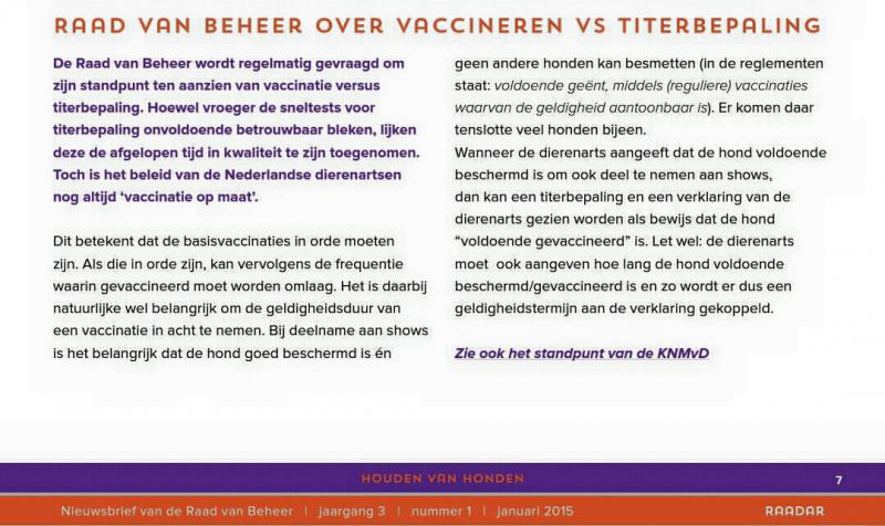 Met een positieve titerbepaling (In het Europees dierenpaspoort) is deelname aan shows en toegang tot pension of asiel mogelijk. Wanneer de dierenarts aangeeft dat de hond voldoende beschermd is, dan kan een titerbepaling en een verklaring van de dierenarts gezien worden als bewijs dat voldoende gevaccineerd is. De dierenarts dient in het vaccinatieboekje wel aan te geven voor hoe lang de hond beschermd is en zo wordt er een geldigheidstermijn aan de verklaring gekoppeld, aldus Raad van Beheer, Dibevo, KNMvD, NVWA en KMSH.